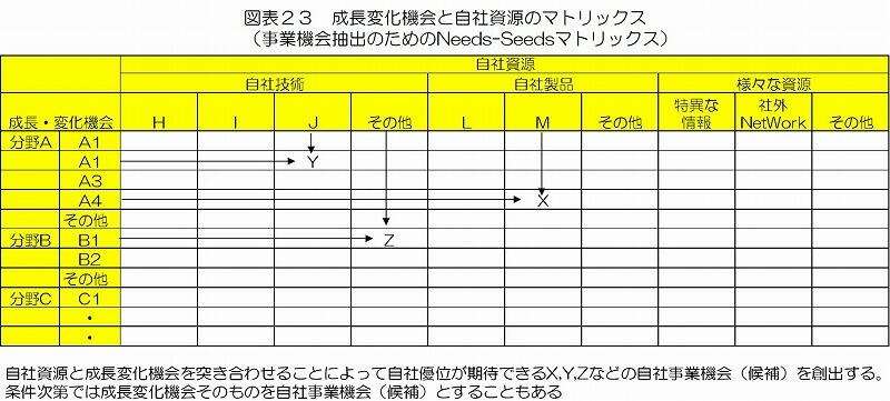 まず、具体的には成長、変化と自社資源のマトリックス図表23を作成し、そのマトリックスのセル(交点)ご