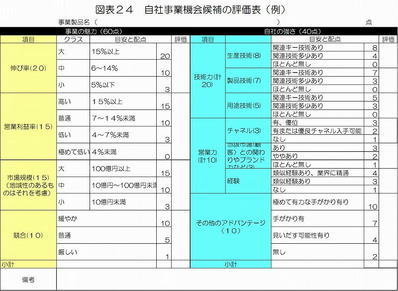 この評価で上位を占めるものが自社の製品レベルの事業機会となるが、個々の製品レベルの事業機会は規模など