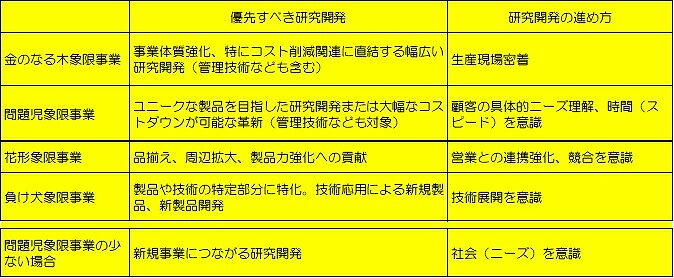 業・製品では自ずと処置が異なる。また、花形象限の事業・製品での研究開発は新型製品開発や品揃