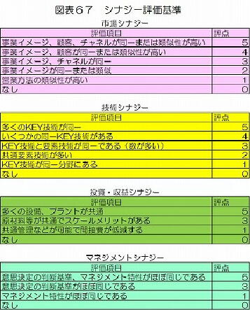 シナジー分析は極めてシンプルで、図表67のような評価表に基づく評点を「営業シナジー」「技術シナ