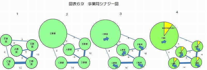 シナジー分析の数値だけで作成した図表69の1で見る限り、C事業とD事業、D事業とB事業の間には